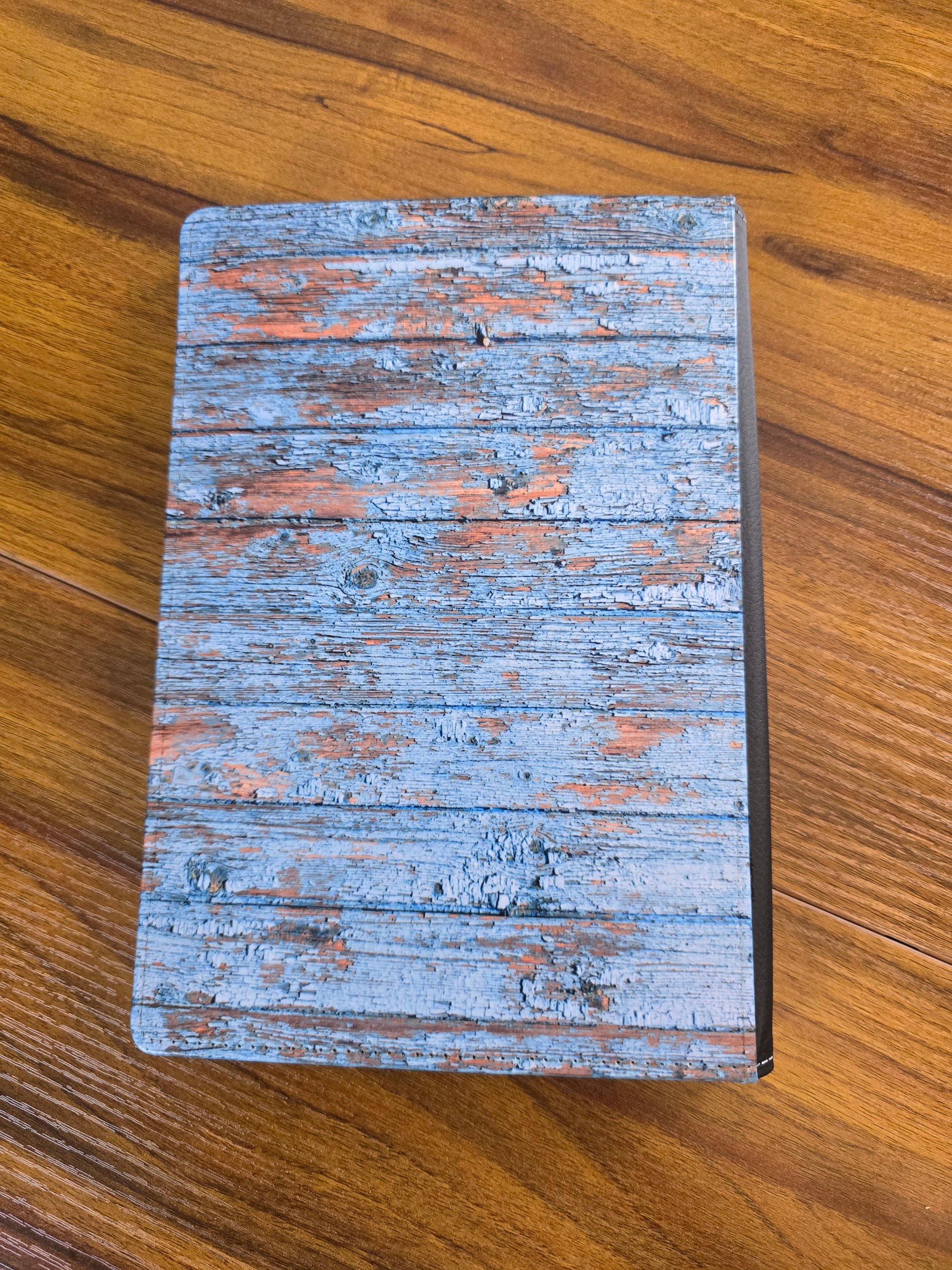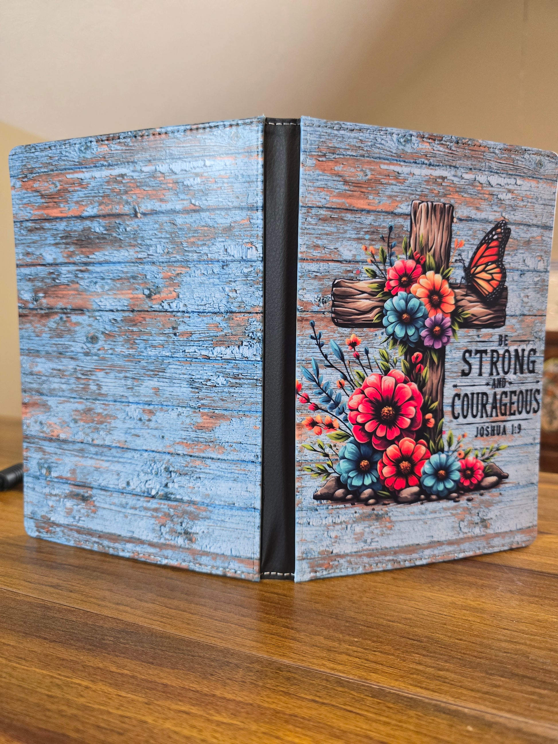 - Black spine separates the front and back cover.